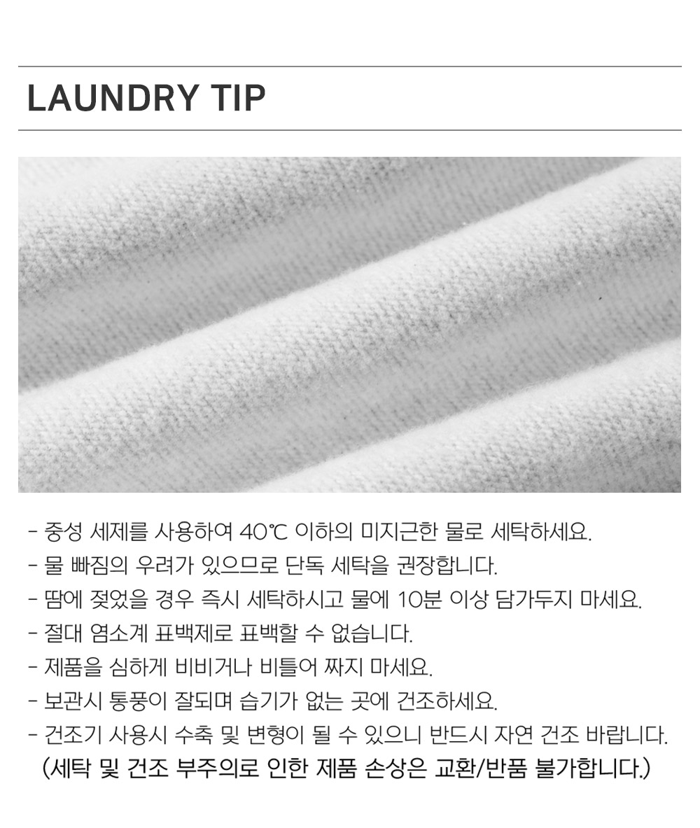 • 인쇄가 있는 제품은 뒤집어서 손세탁을 하거나 세탁기 사용시 세탁망을 이용해 주세요.