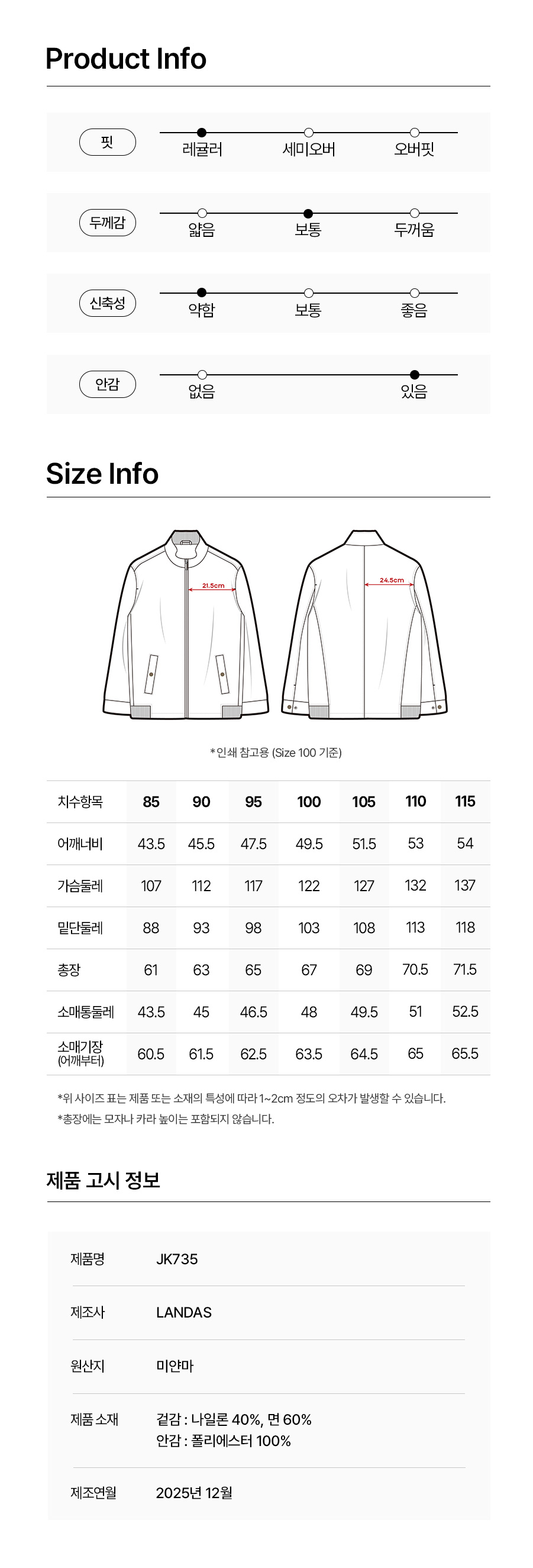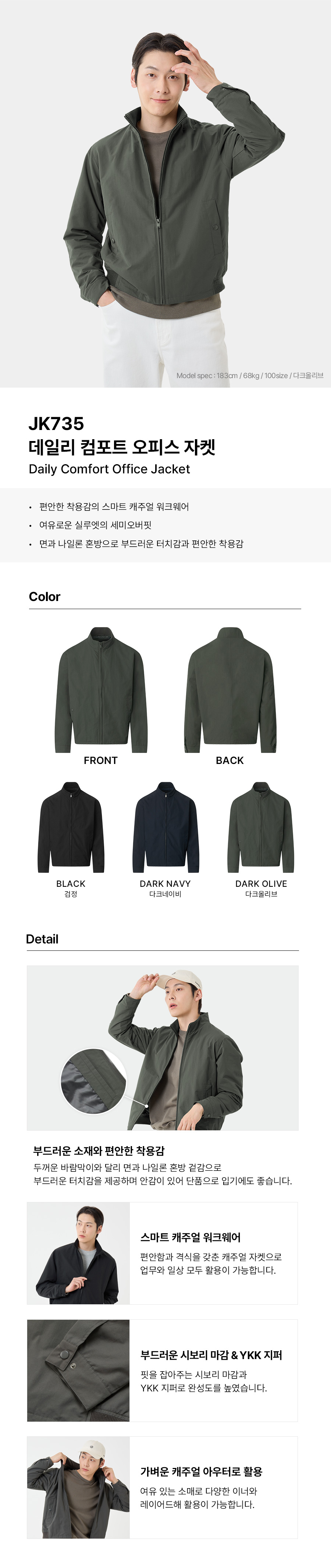 (S~4XL) 스마트 캐쥬얼 워크웨어로 세미오버핏의 착용감을 느낄수 있으며 회사근무복 및 단체자켓으로 최적인 상품입니다.